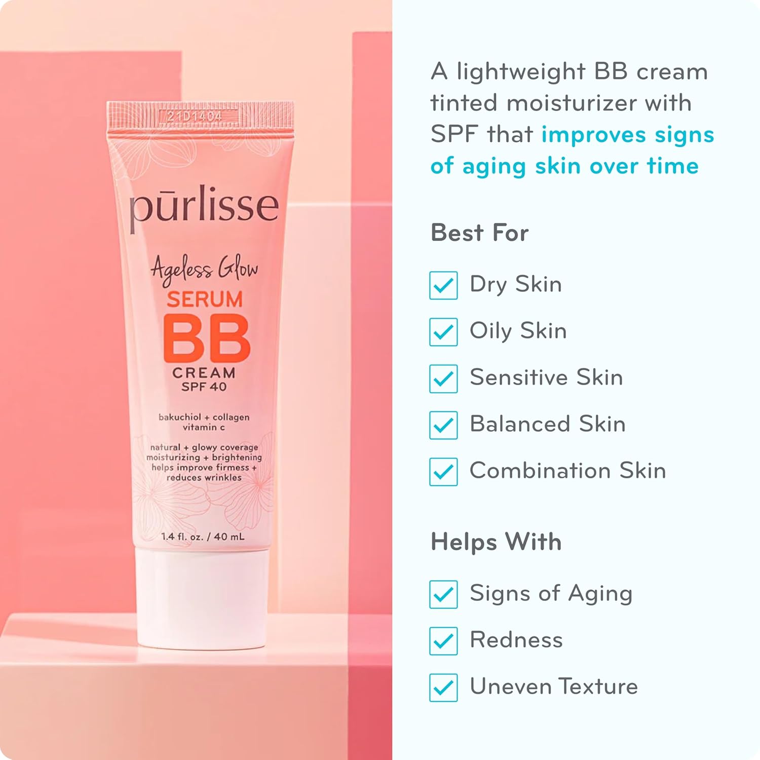 pūrlisse Ageless Glow Serum BB Cream SPF 40 - Glow BB Cream with SPF Enriched with Bakuchiol & Vitamin C to Help Improve Firmness & Reduce Wrinkles for Dewy Skin - Tan (1.4 oz)