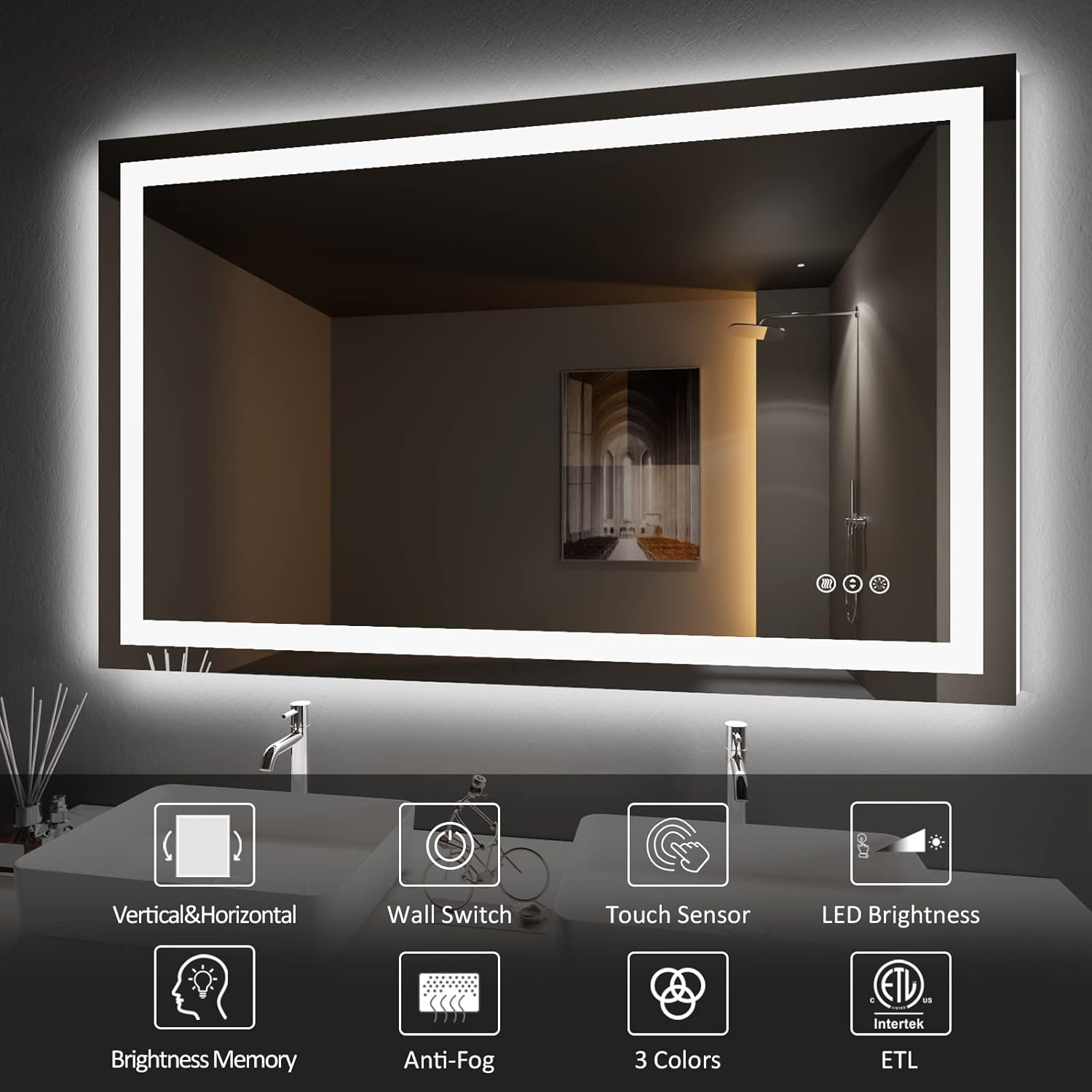 - [Anti-fog]: After a few minutes of opening the defogger, the heater in the mirror will disperse the fog from the center to sides, the mirror will still reflect clearly in the bathroom surrounded by hot air; It will turn on with the power on and automatically turns off after 1 hour