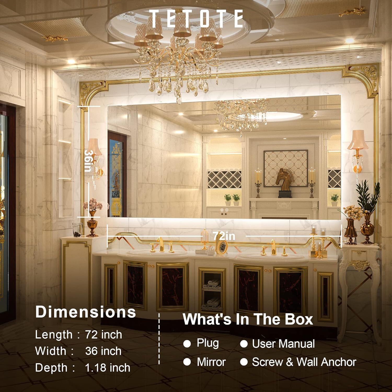 TETOTE 72 x 36 Inch LED Bathroom Mirror Backlit,AntiFog,Dimmable,CRI90+,Makeup,Vanity Mirror with Light,Lighted Mirror,Wall Mounted(Horizontal/Vertical)