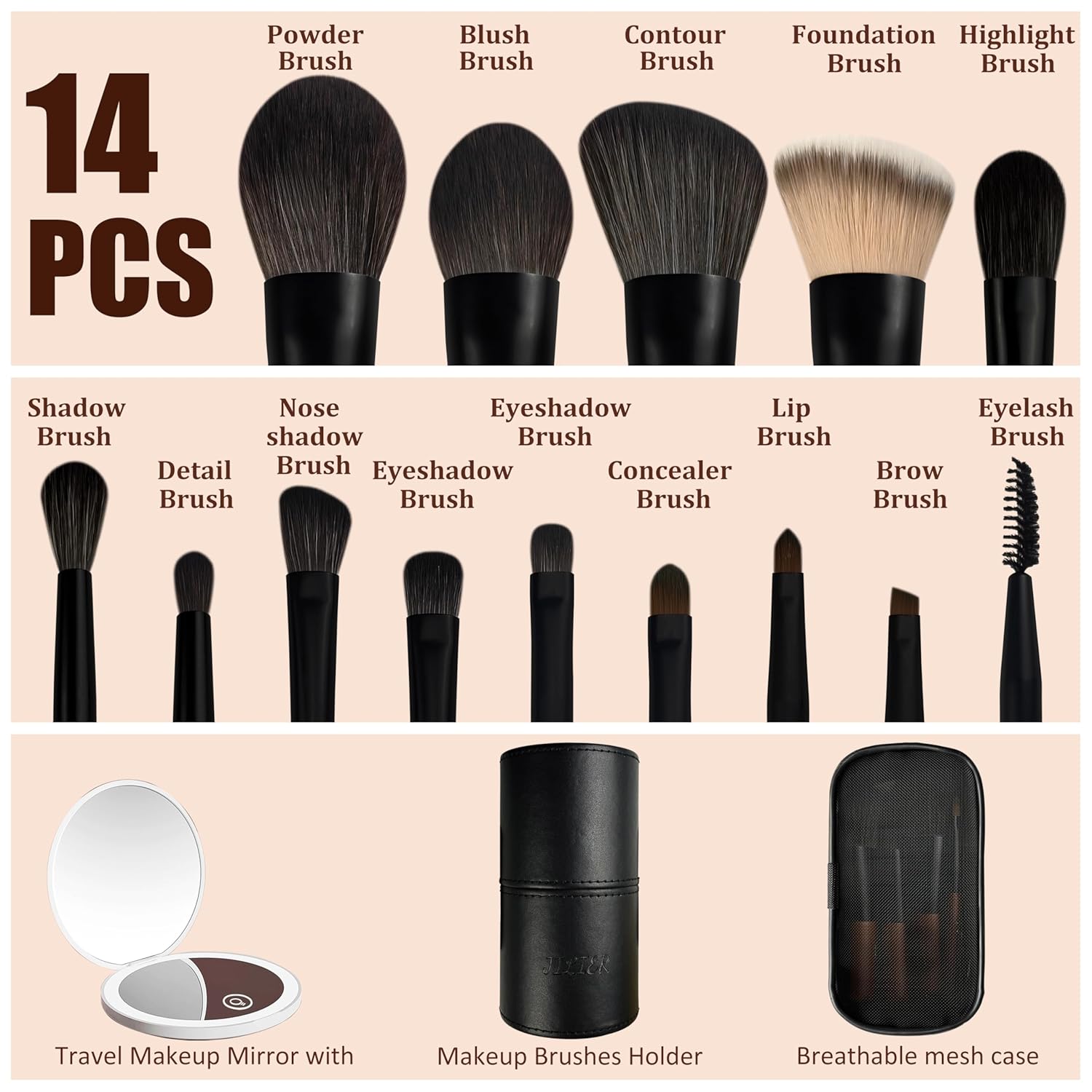 Jilier 14 pcs Mini Makeup Brushes and Pocket Mirror, Travel Makeup Brush Set, LED Compact Mirror with Light, Travel Size with Case, Portable for Handbag, Travel Essentials for Women