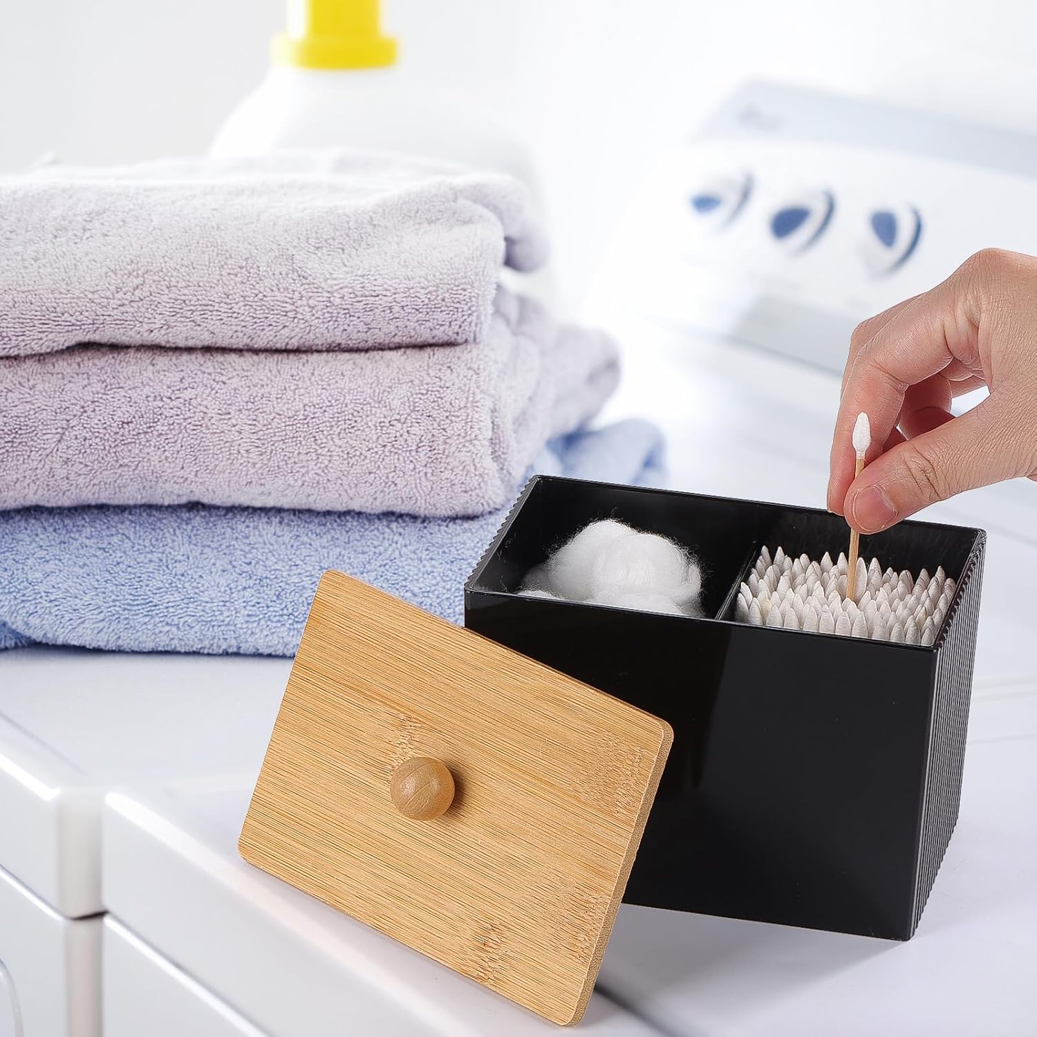 - The Qtip holder can store cotton rounds/swabs/balls, floss picks, and other bathroom accessories.