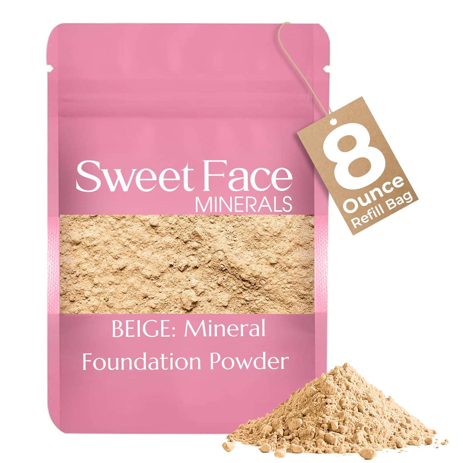 Foundation Powder Refill (BEIGE)(8 Ounce Bag) By Sweet Face Minerals, Lightweight Mineral Loose Makeup Powder with SPF 20, Full Coverage Flawless Finish, Talc-free, Cruelty-Free, Refillable Pouch