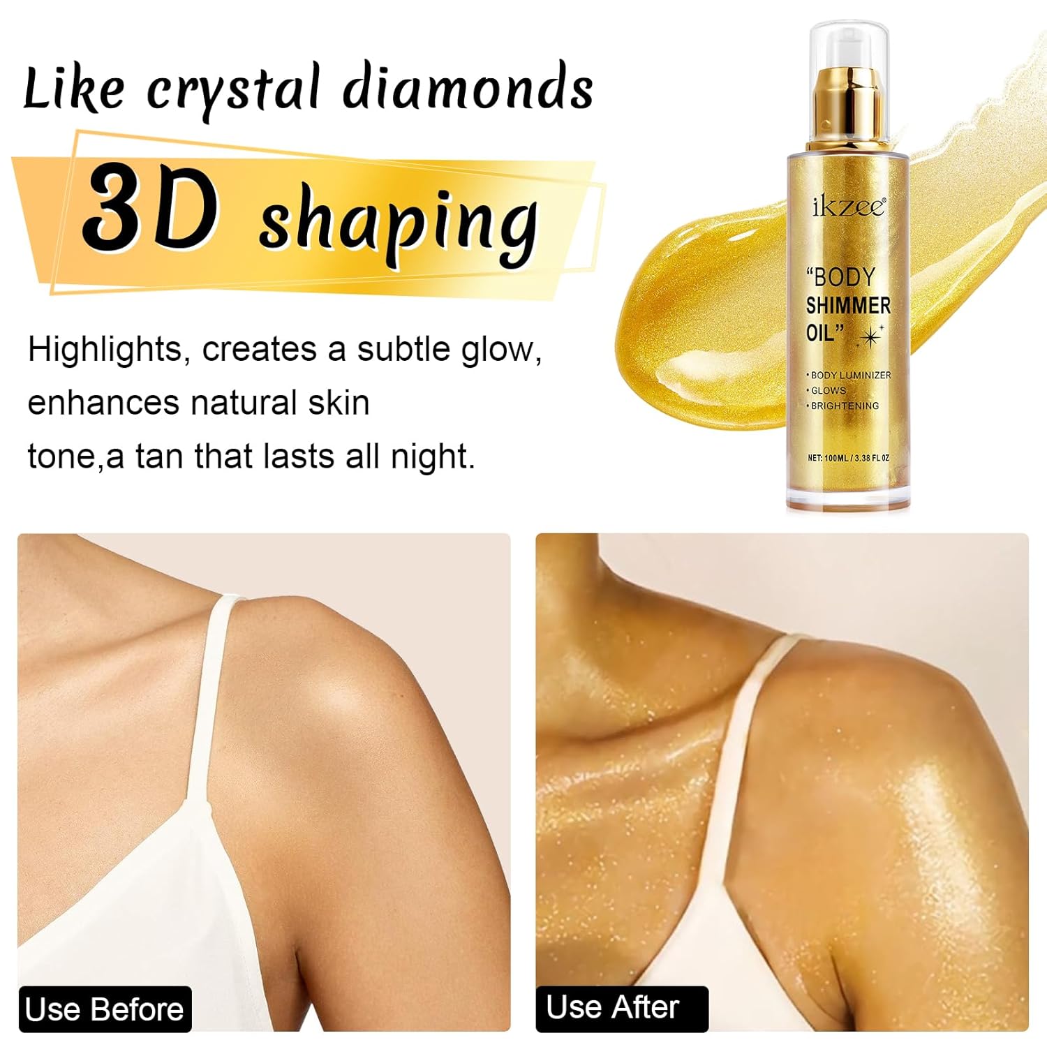 - β¦ SHIMMERING BODY GLOWING LUMINIZER -- This shimmer body oil brightens your complexion, the flecks of shimmer catch the light and make your skin glow, giving your skin an attractive shimmer in the sun, giving you a more natural and healthier complexion.