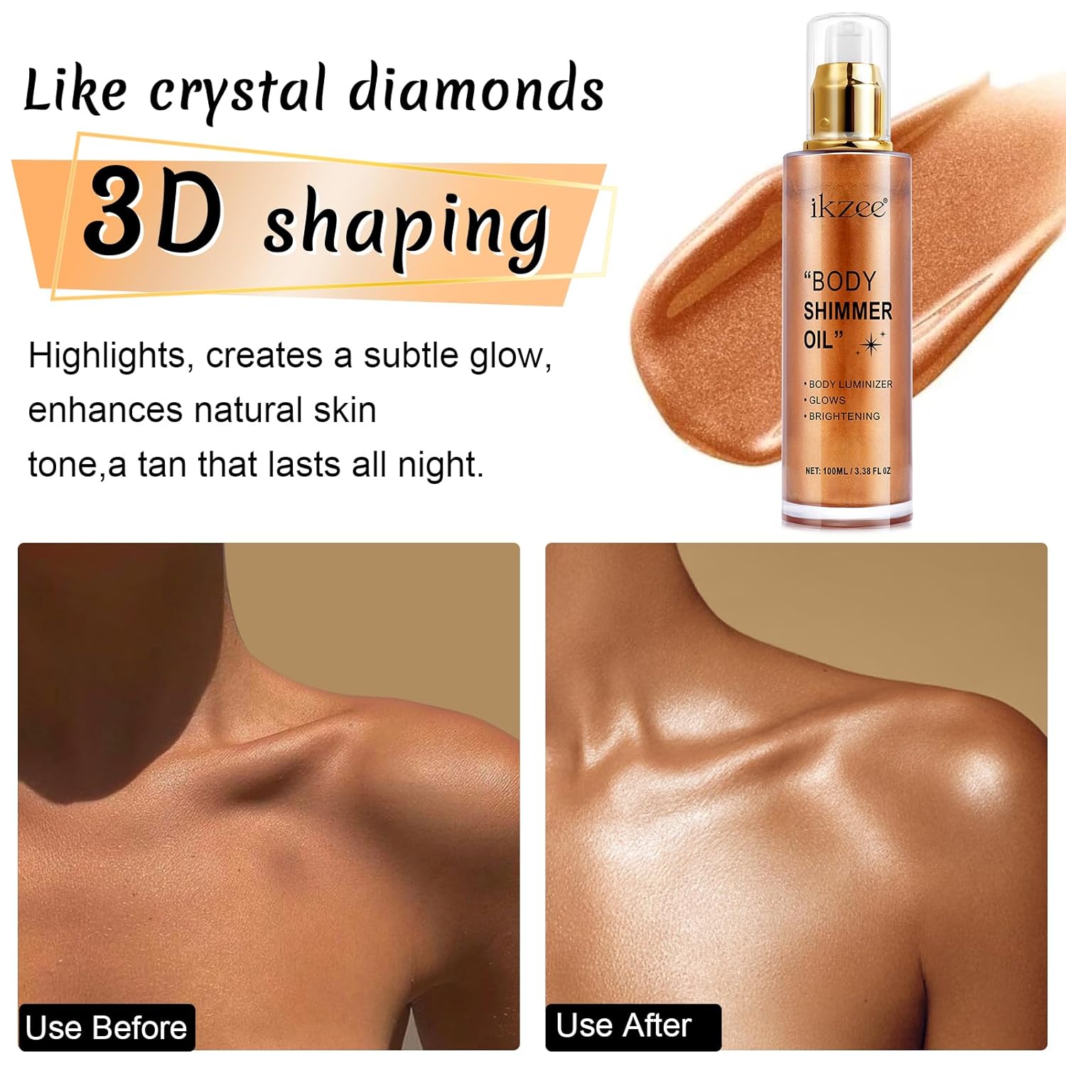 - β¦ SHIMMERING BODY GLOWING LUMINIZER -- This shimmer body oil brightens your complexion, the flecks of shimmer catch the light and make your skin glow, giving your skin an attractive shimmer in the sun, giving you a more natural and healthier complexion.