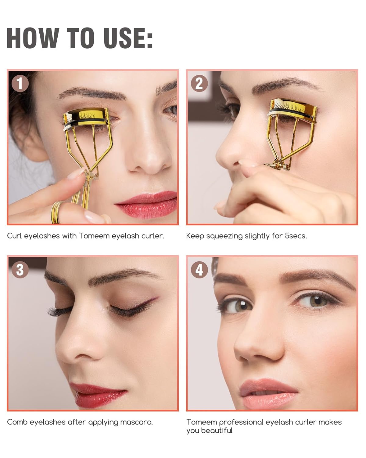 - Intimate Design: TOMEEM eyelash curlers adopts radian design suitable for all eye types, upgraded handle and soft silicone pad, easily create curled eyelashes in a few seconds without pinching eyelids and pulling eyelashes. Lash Curler curls lashes from base to tip creating a wide-awake look.