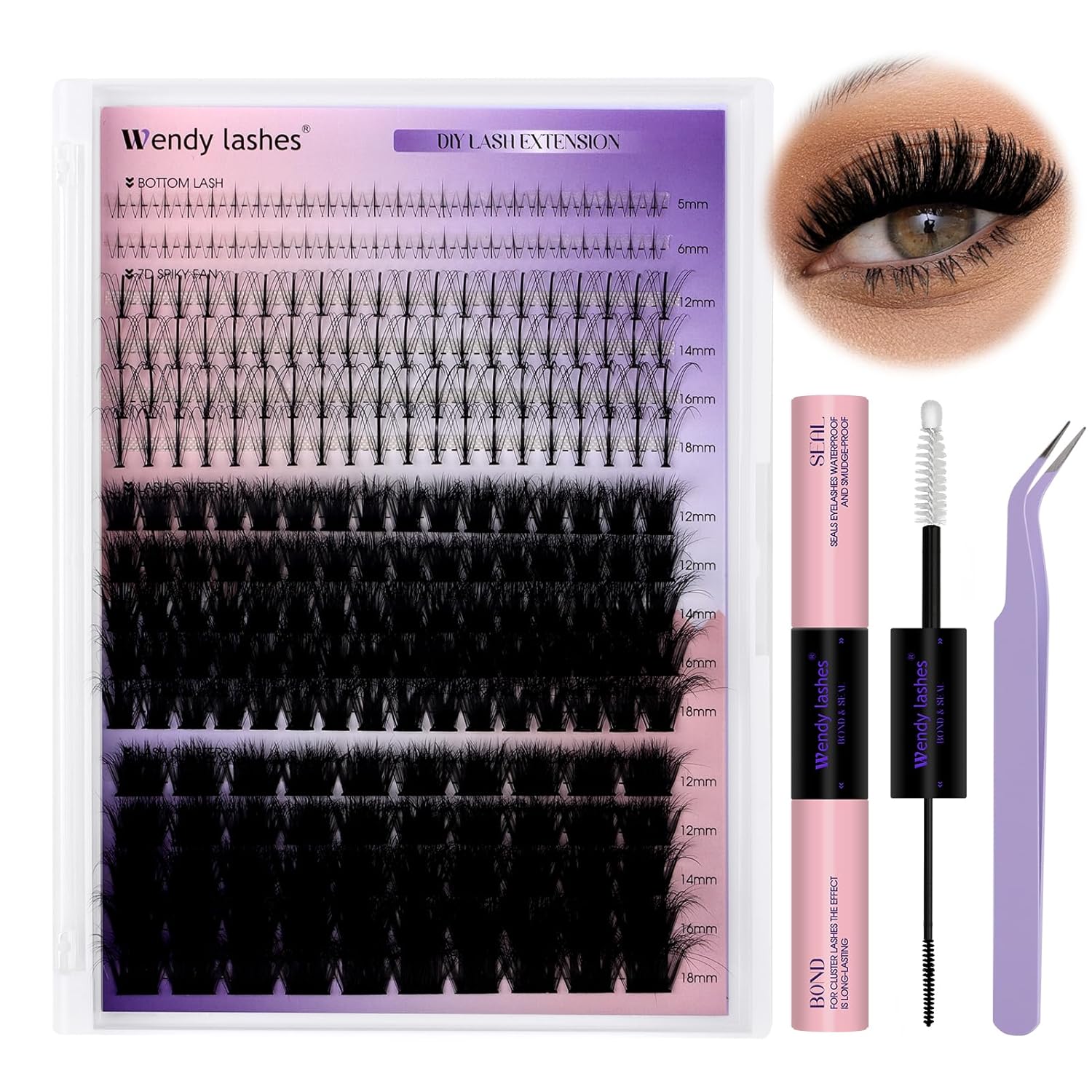 - NEWLY UPGRADED LASH EXTENSION KIT: you'll get a combination tray of upper and lower lashes (including 2 rows of bottom lashes, 4 rows of spike lashes, 4 rows of lash clusters, and 4 rows of another style of lash clusters), lash bond and seal, a lash tweezers with a great grip!