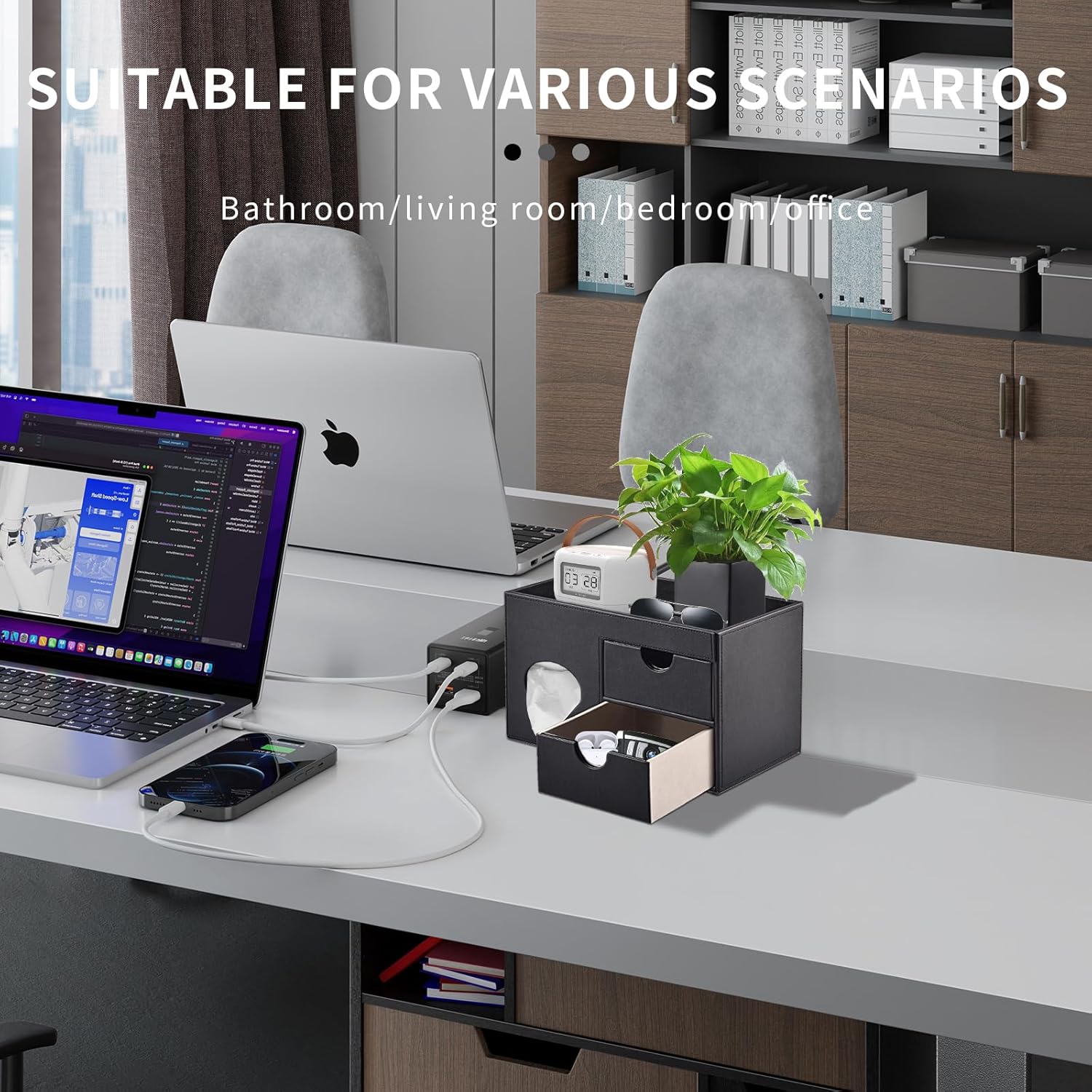 - Multifunctional tissue box lid storage box-The tissue box lid and 1 Storage Tray and 2 Mini Drawer,Very suitable for storing all remote controls ,mobile phone, glasses, or pencils/pens,cosmetics, perfumes,jewelry, Makeup brushes, lipsticks potted plants, etc., Make the desktop well-organized and neat.