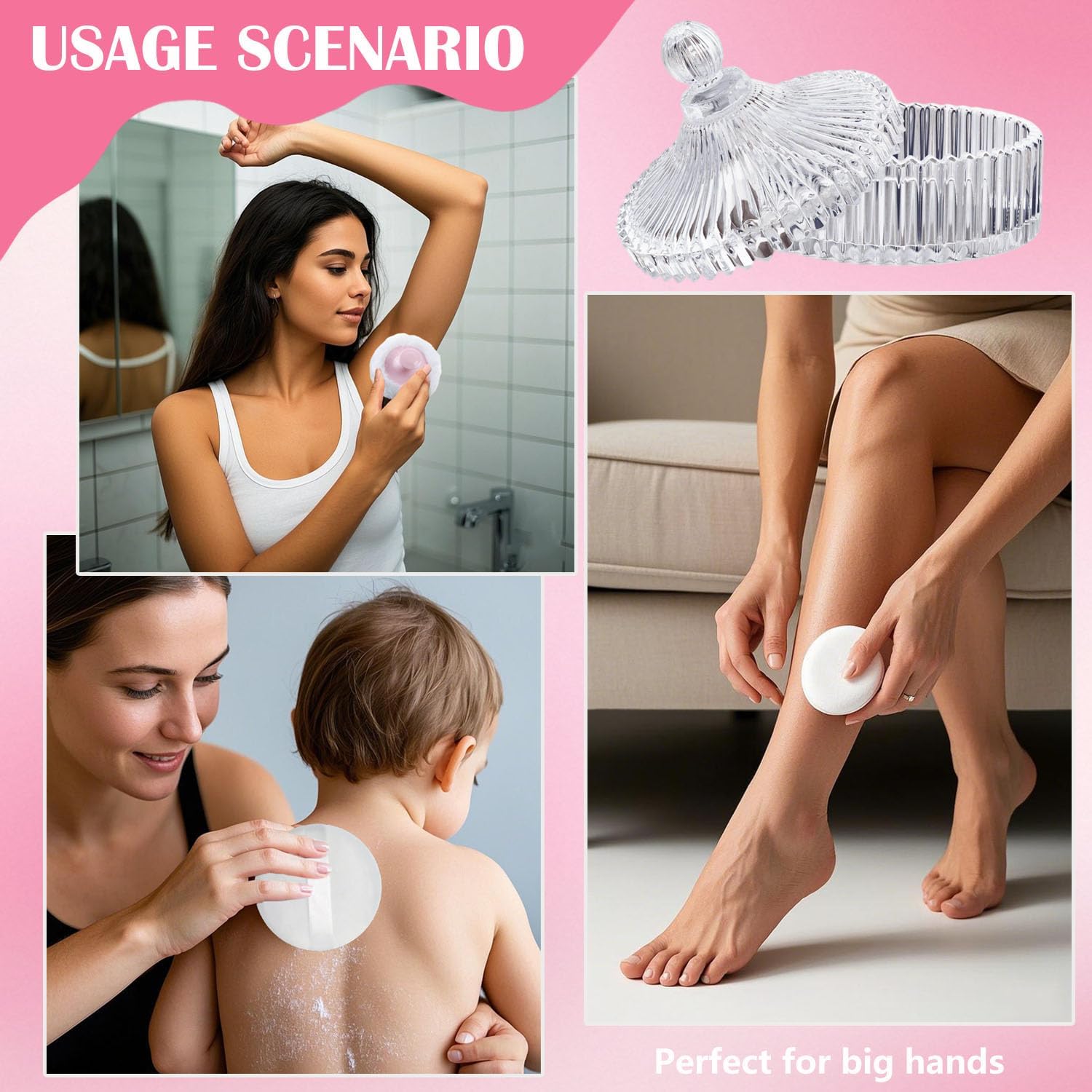 - 【Stylish Body Puff and Container】The container has an enlarged opening for easy access to the body puff, thick glass for long-lasting durability, and a flat base ensuring stable placement. Its European classic design, adorned with carved textures, looks great. The lid and container have a tight, gear-like fit (not sealed). The top-knob simplifies opening and closing. It's easy to clean and multi-functional.