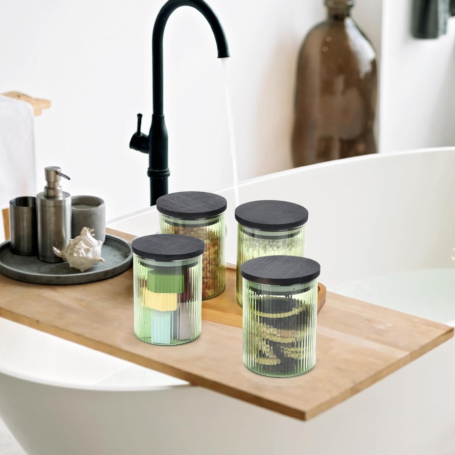 - Stylish Vanity Organizer: These apothecary jars not only serve as functional storage containers but also add a chic touch to your makeup organization. Use them to store beauty eggs, hair ties, and floss picks while enhancing your vanity decor and overall aesthetic of your bathroom.