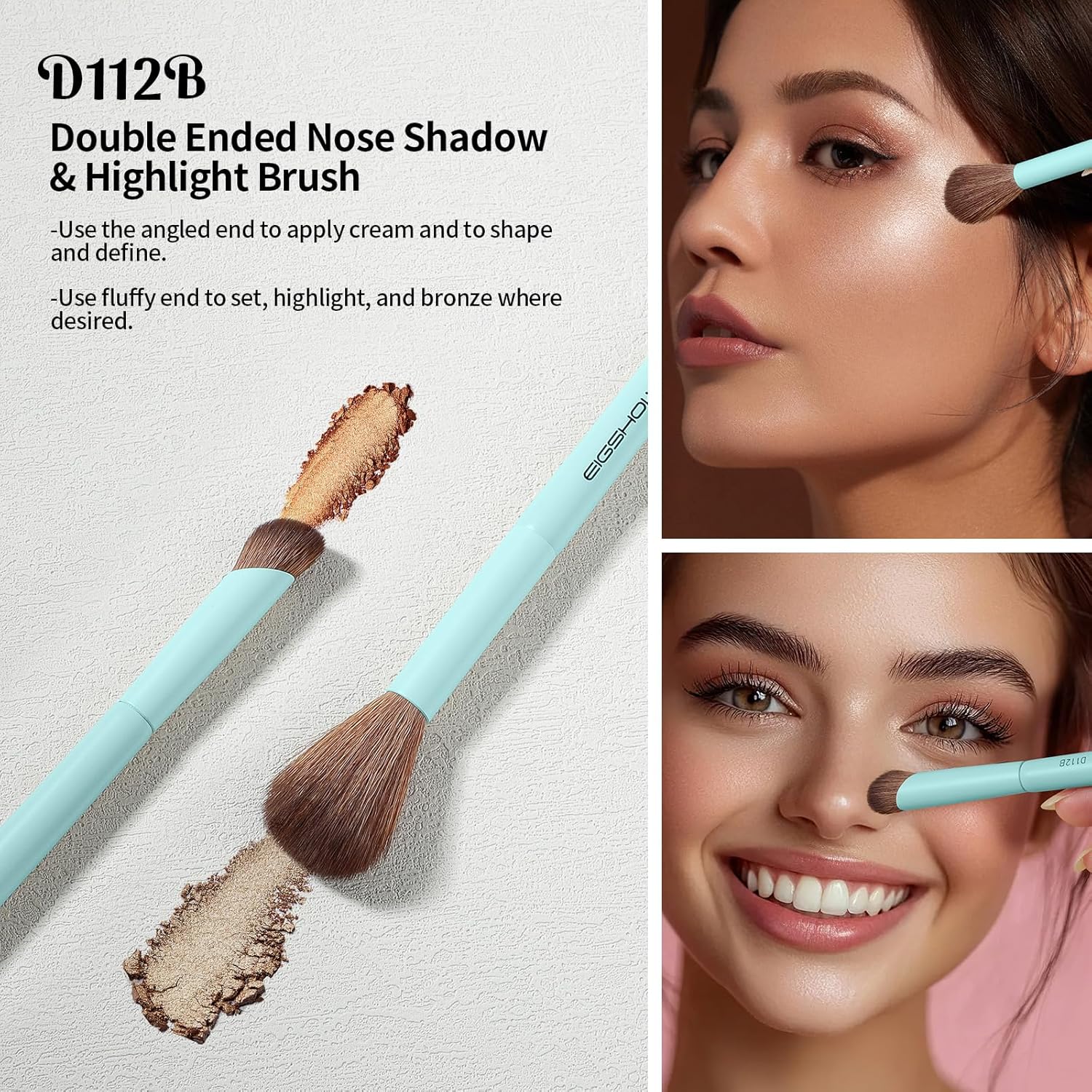 EIGSHOW Makeup Brush Set, 3Pcs Dual Ended Face Makeup Brushes for Foundation Powder Contour Highlight Concealer Nose Shadow, Travel Gift Set (Cyan)