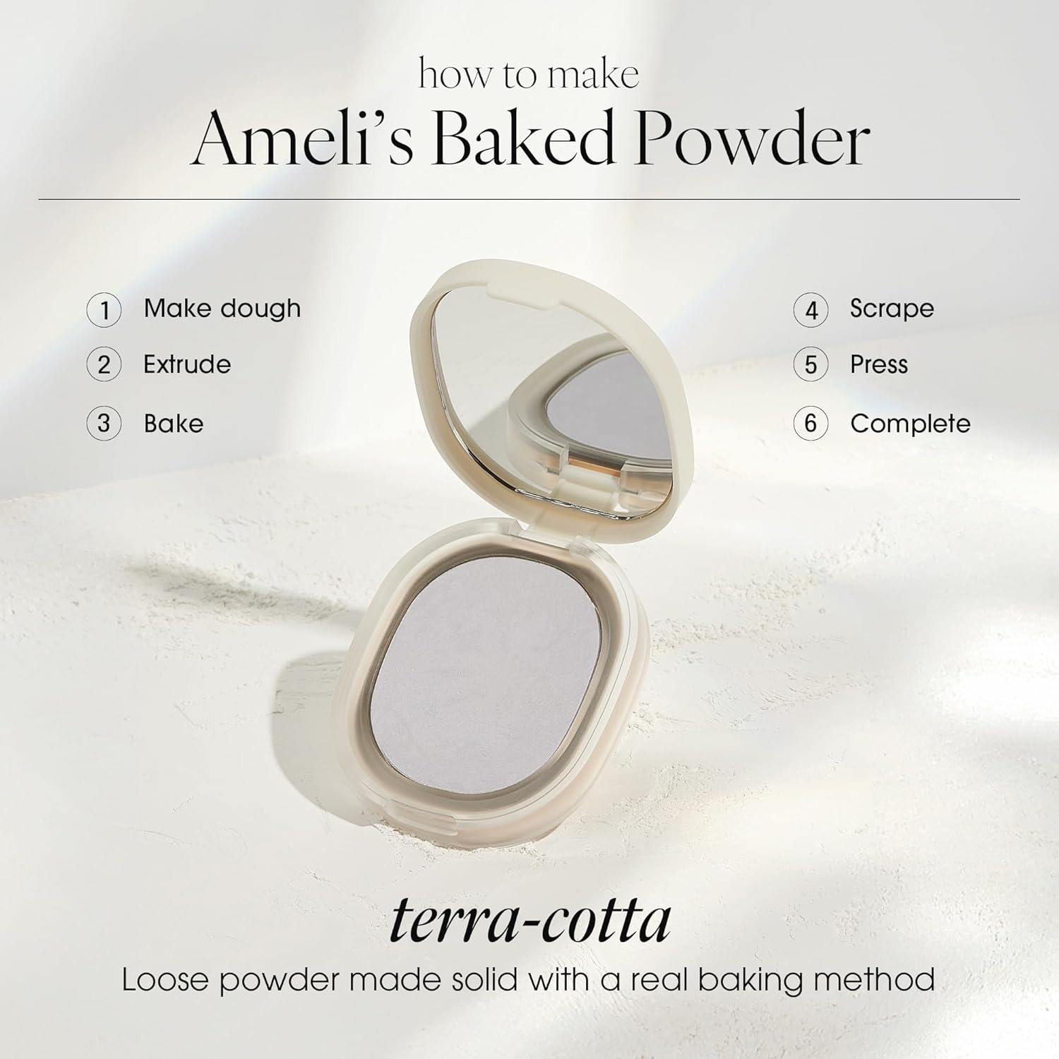 - TERRA-COTTA TECHNOLGY: Baked Powder Collection uses Terra-cotta technology, like terra-cotta, loose powder is kneaded with water and baked in an oven, creating a dry clay-like base with moisture packed into it. Unlike pressed powder, Ameli's Baked Powder porous characteristics allows it to be highly breathable and hydrating, making it great on even dry skin.