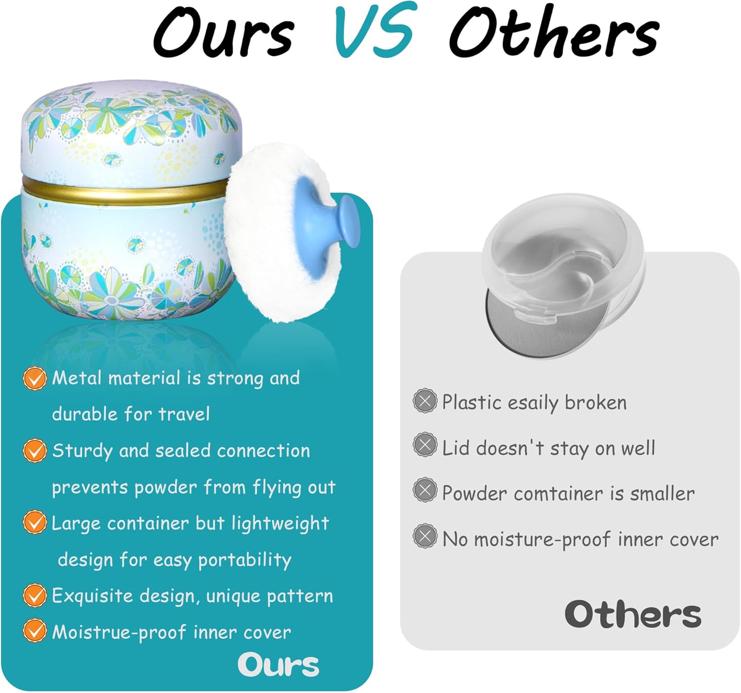- The powder box has a delicate appearance and a variety of patterns for you to choose. The powder box is made of high-quality tinplate, which are not easy to break after being dropped, and not fade easily, and can be used for a long time. There is also a lid inside the powder box, so you don't have to worry about spilling powder.