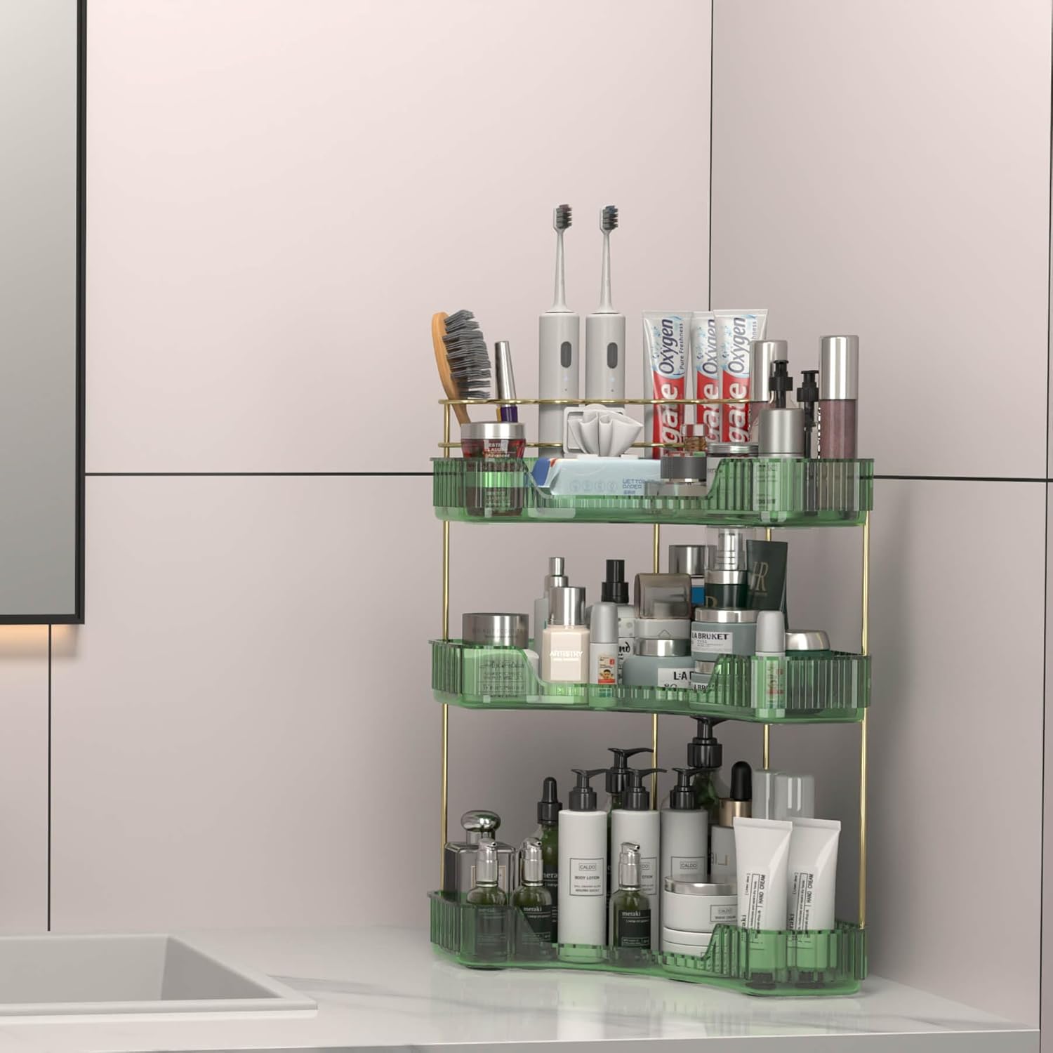 3 Tier Corner Bathroom Organizer Countertop, Vanity Makeup Organizer with Brush Holder, Space-Saving Skincare Storage Corner Shelf for Bathroom, Dressing Table, Kitchen