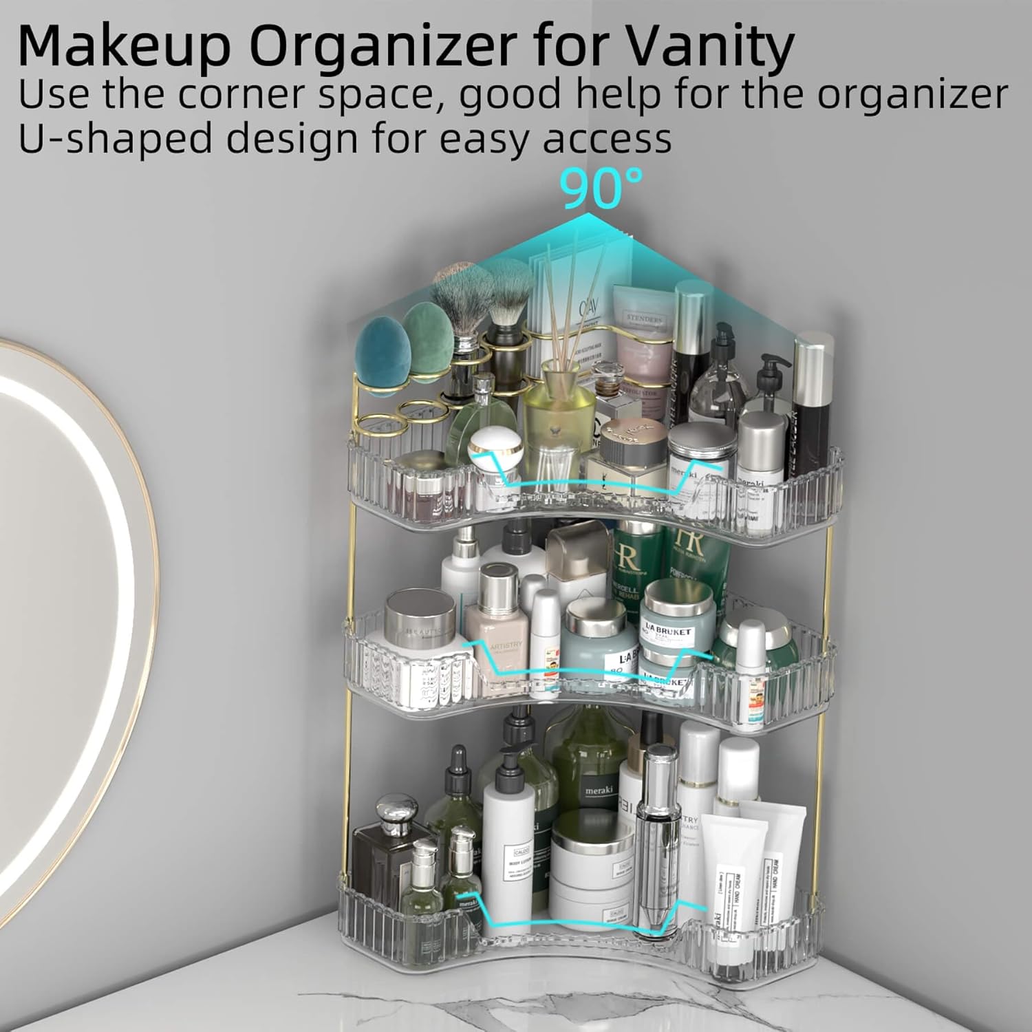 - 【90° Corner Bathroom Counter Organizer】The 90° quarter-circle design maximizes the unused space that snugly fits bathroom/vanity corners. Multi-layer structure adds 100% vertical storage while occupying minimal counter space.