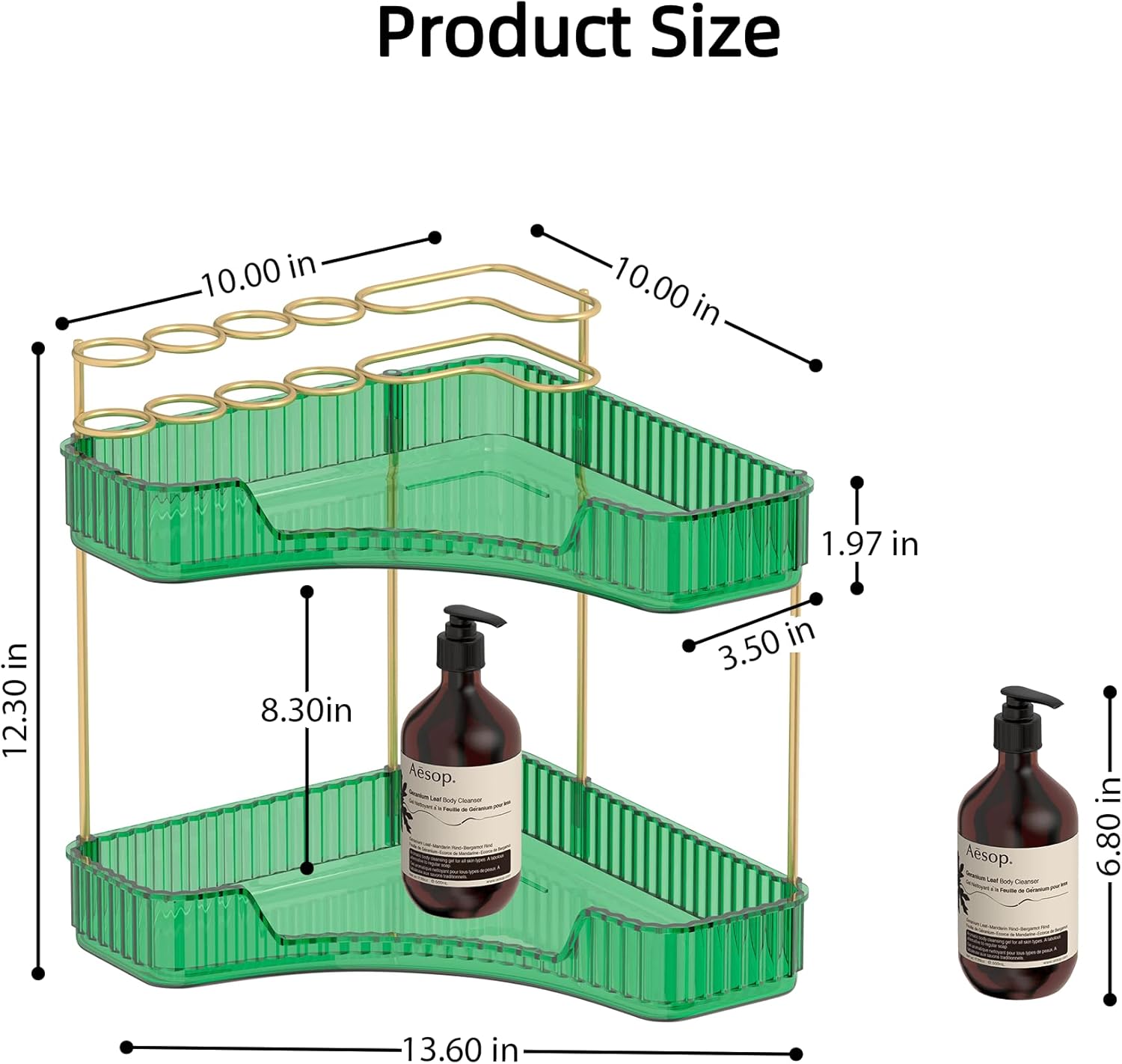 2 Tier Corner Bathroom Organizer Countertop, Vanity Makeup Organizer with Brush Holder, Space-Saving Skincare Storage Corner Shelf for Bathroom, Dressing Table, Kitchen