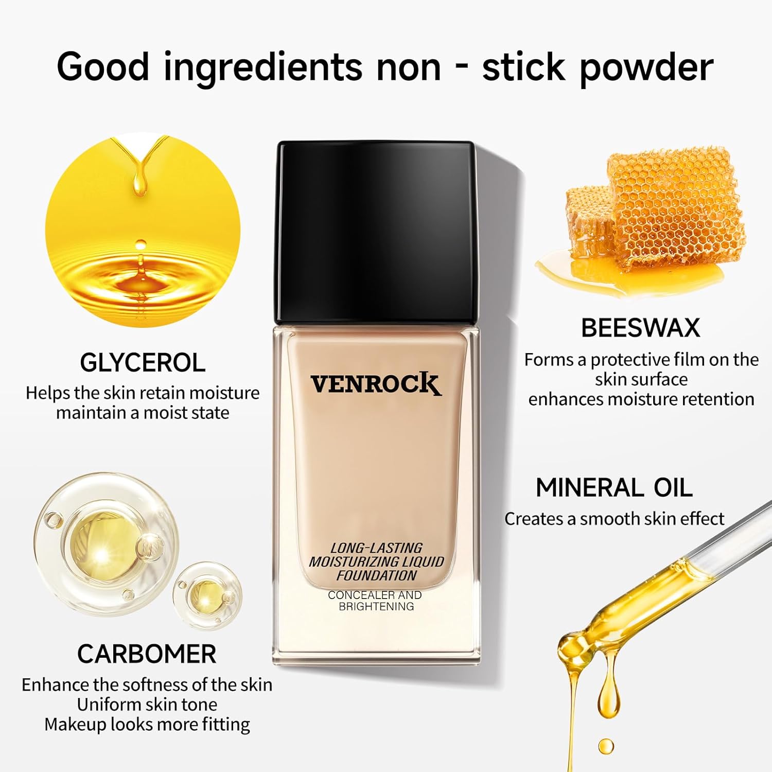 VENROCK 24HR Long-Lasting Moisturizing Liquid Foundation | Radiant, Waterproof, Concealing & Oil-Control (02# Beige, 30ml)
