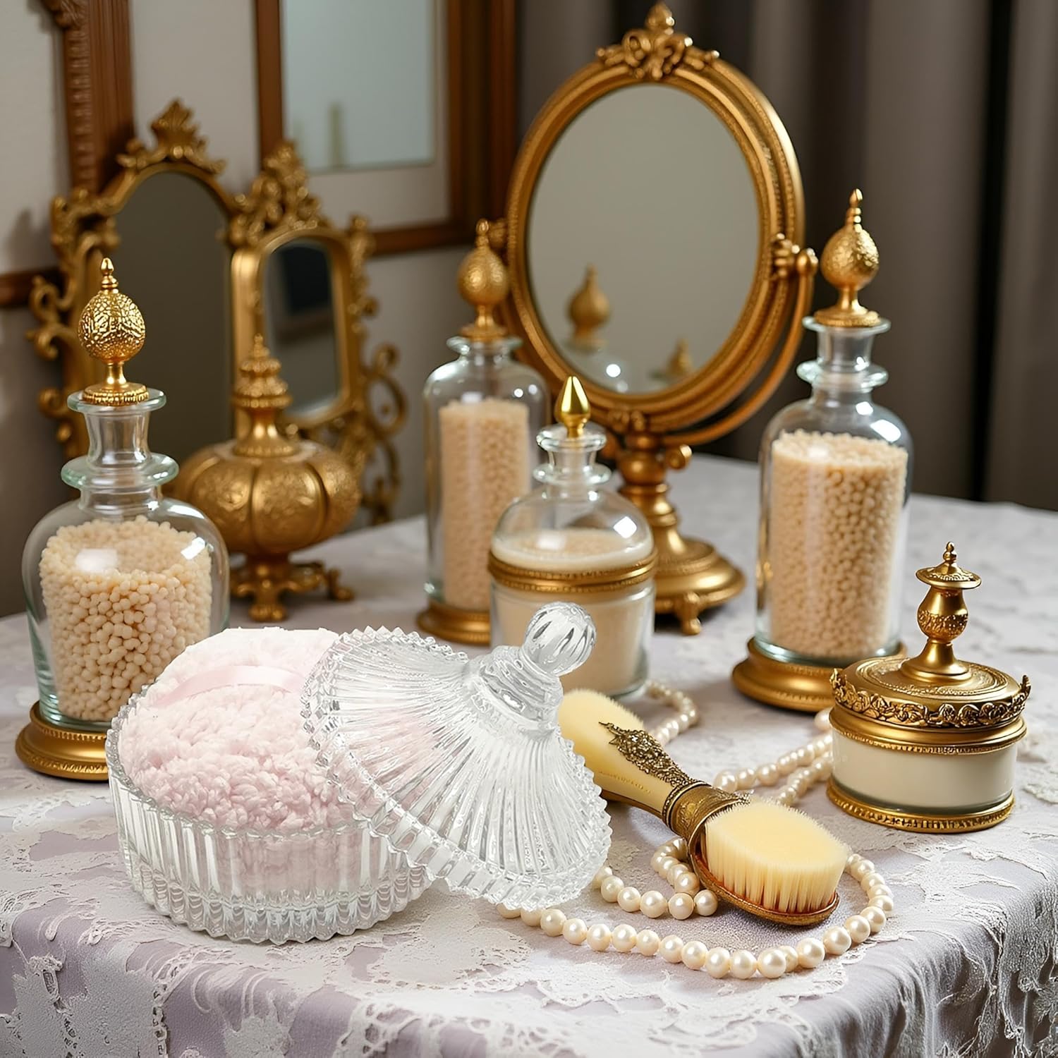 - 【Unique Design】This classic glass jewelry box has delicate and lovely beautiful embossed pattern, which makes you look bright, this powder puff case measures 5.9 inches L x 5.9 inches W x 5.9inches H, designed for vanity table storage and decoration