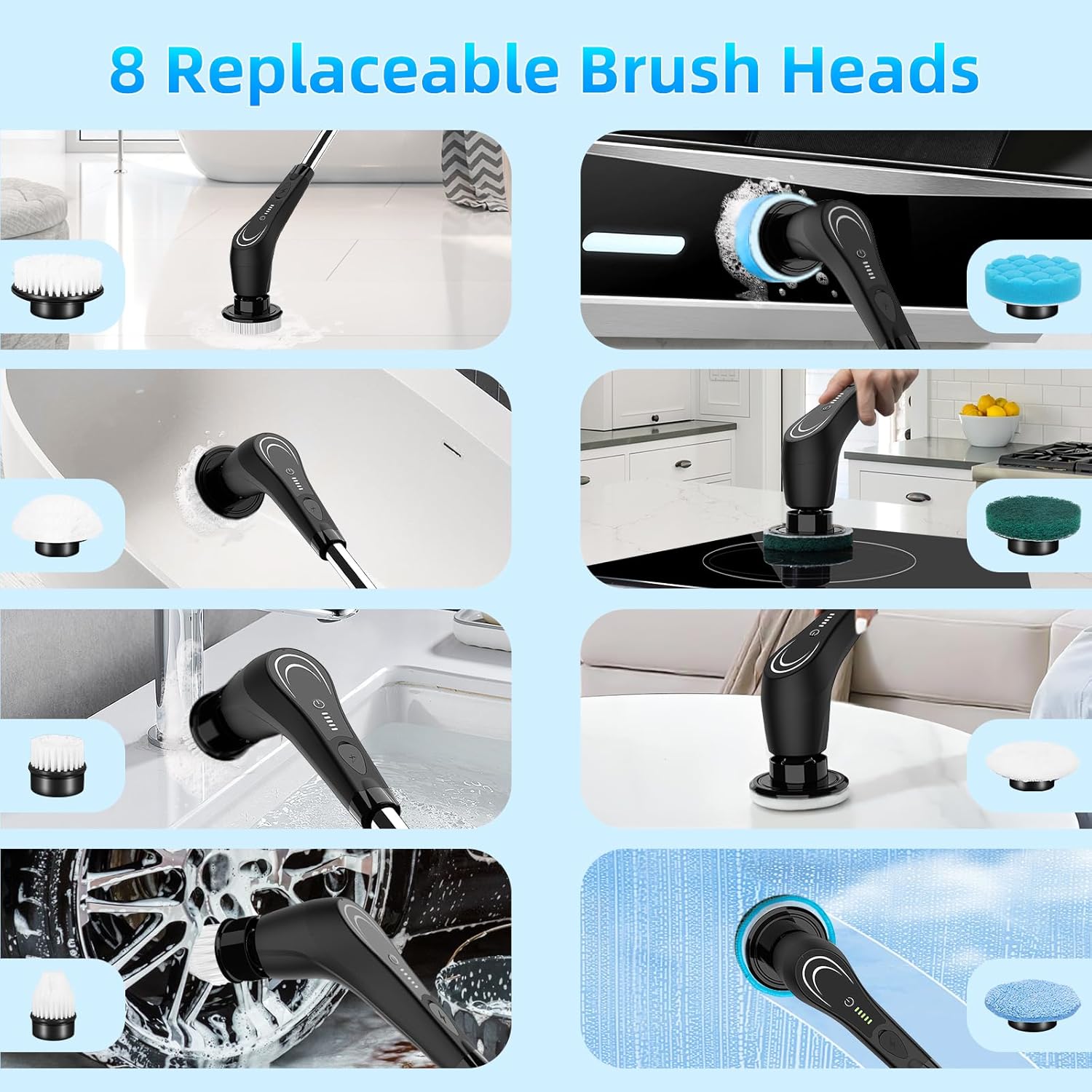 Black Electric Spin Scrubber, Cordless Spin Scrubber with 8 Replaceable Brush Heads, Electric Scrub Brush with Adjustable Extension Handle, Electric Cleaning Brush for Bathroom, Tile and Bathtub