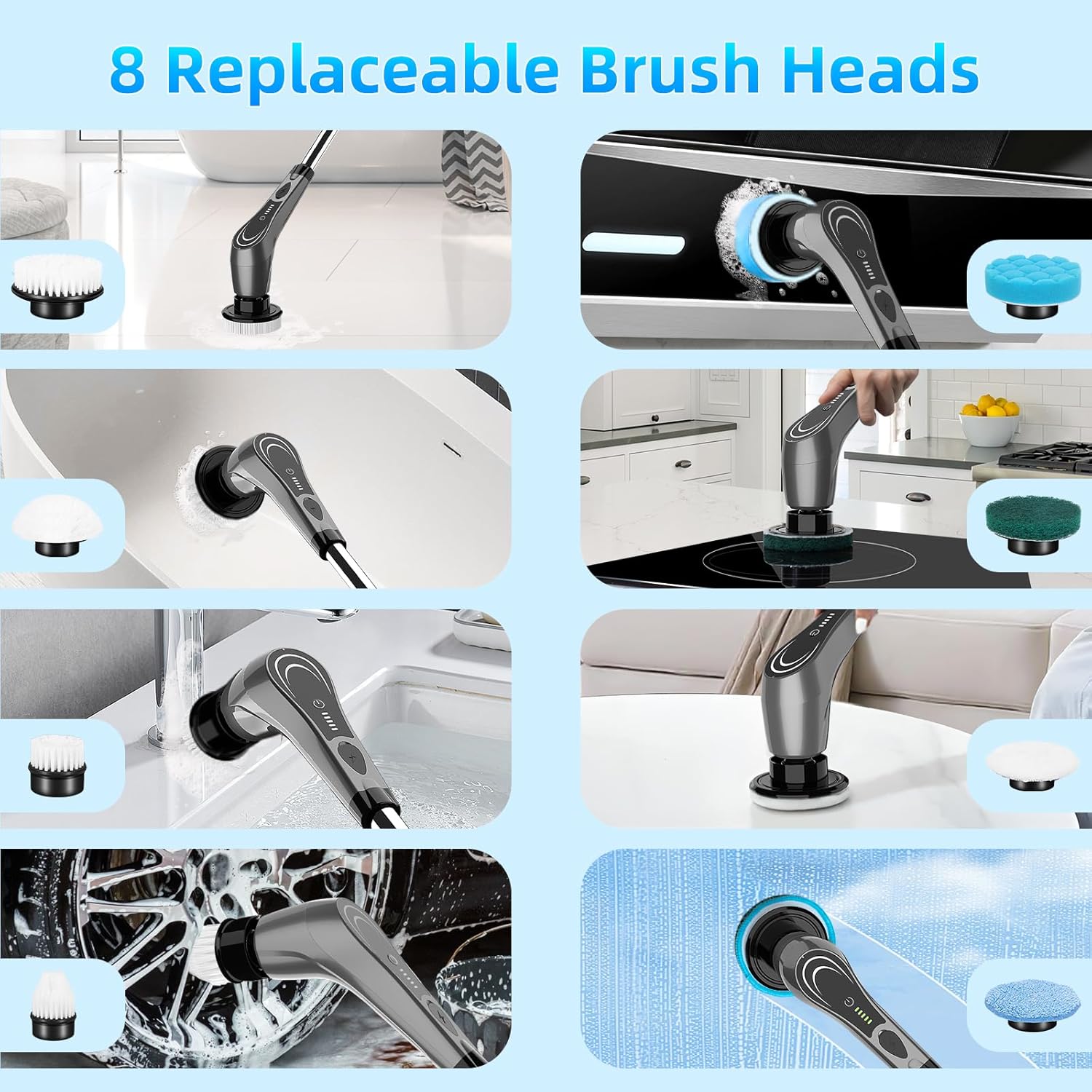 Gray Electric Spin Scrubber, Cordless Spin Scrubber with 8 Replaceable Brush Heads, Electric Scrub Brush with Adjustable Extension Handle, Electric Cleaning Brush for Bathroom, Tile and Bathtub