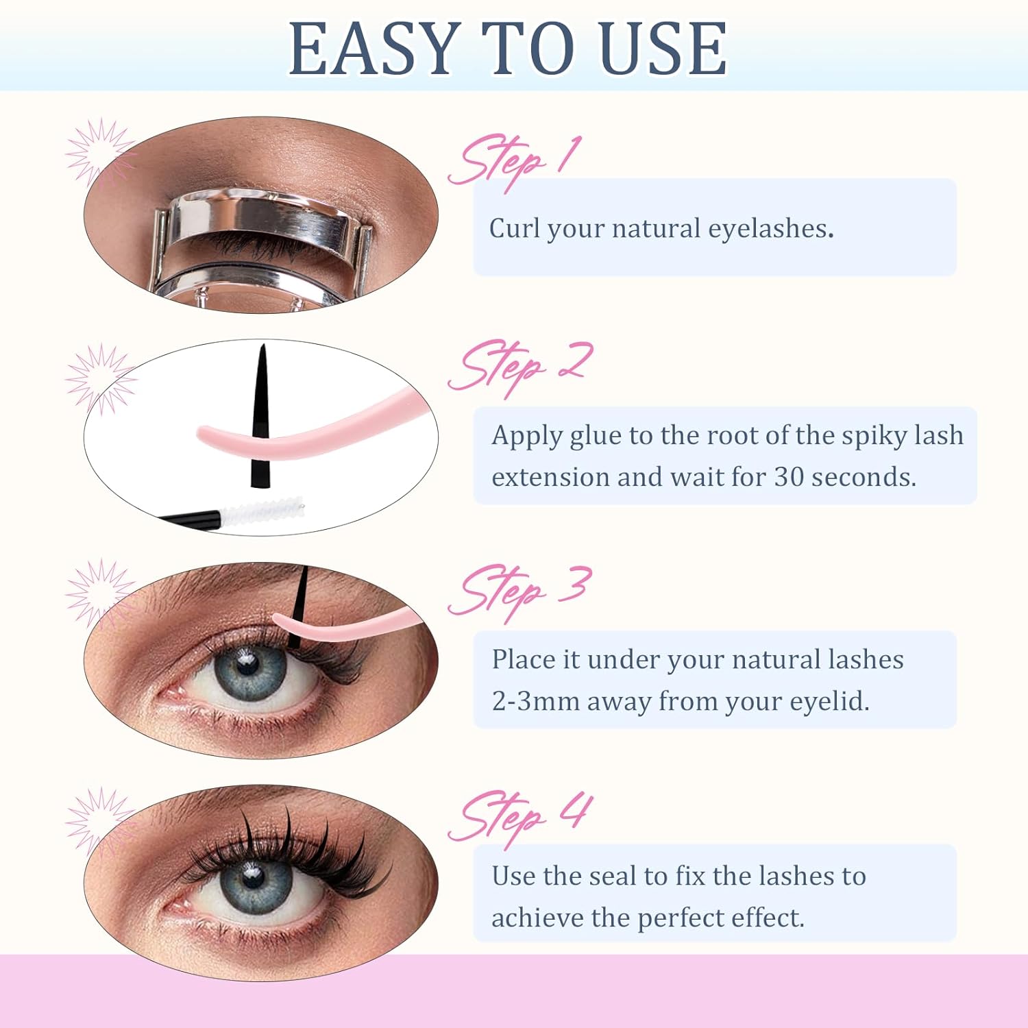 - Stable curl: These individual curled eyelash clusters undergo double heating treatment during the manufacturing process, offering flexibility similar to natural eyelashes, maintaining a perfect shape without easily losing curl. This spike lash clusters extends to imitate a wet appearance and can be used to create a light and wet Korean or manga clusters eyelash effect, ensuring long-lasting comfort throughout the day!