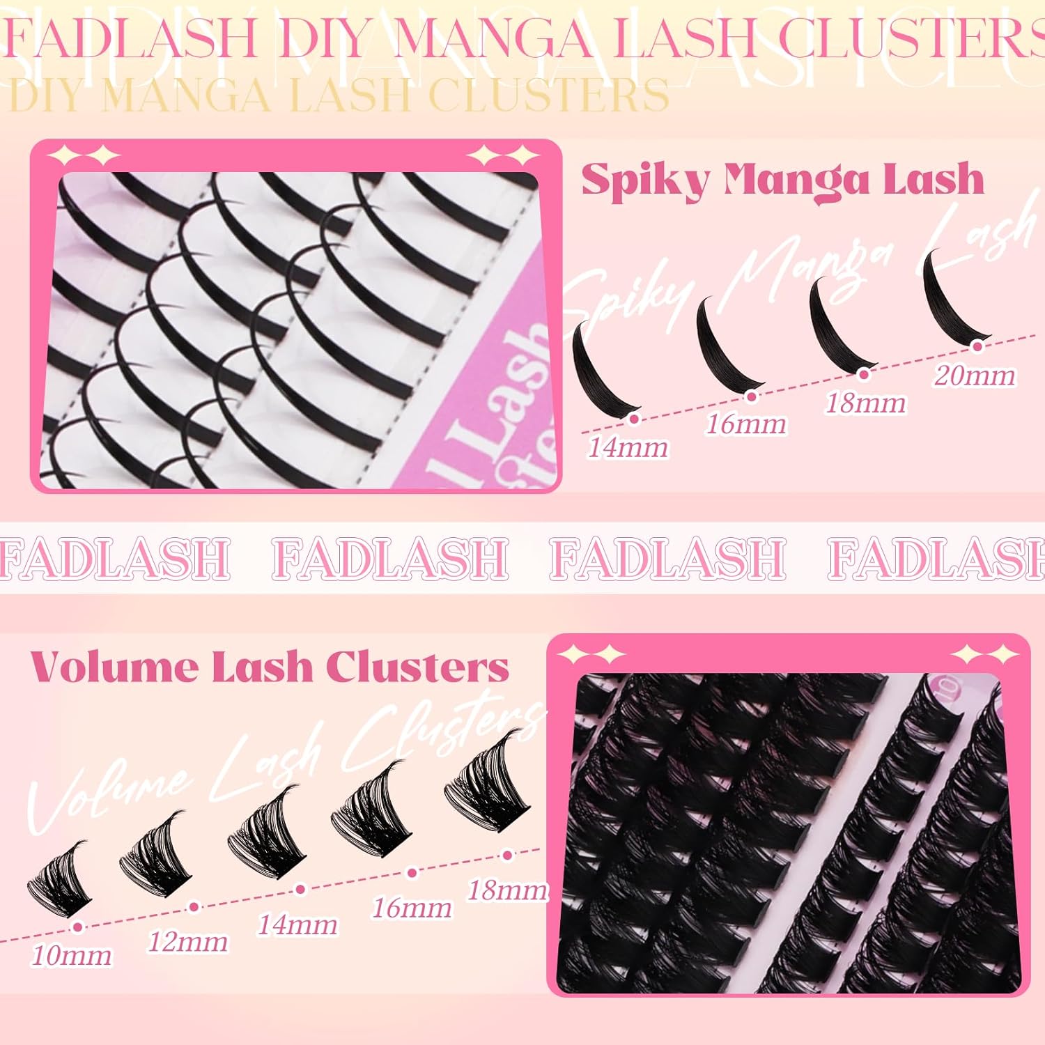 - Curling Eyelash Clusters with Spikes Eyelash: Our advanced series combination of curling clusters eyelash and manga spikes eyelash clusters. You can choose from 14-20mm Spiked lash clusters and 10-18mm D-curled soft eyelashes. Different lengths can be matched with different makeup looks to perfectly showcase a unique comic style eyelash effect.