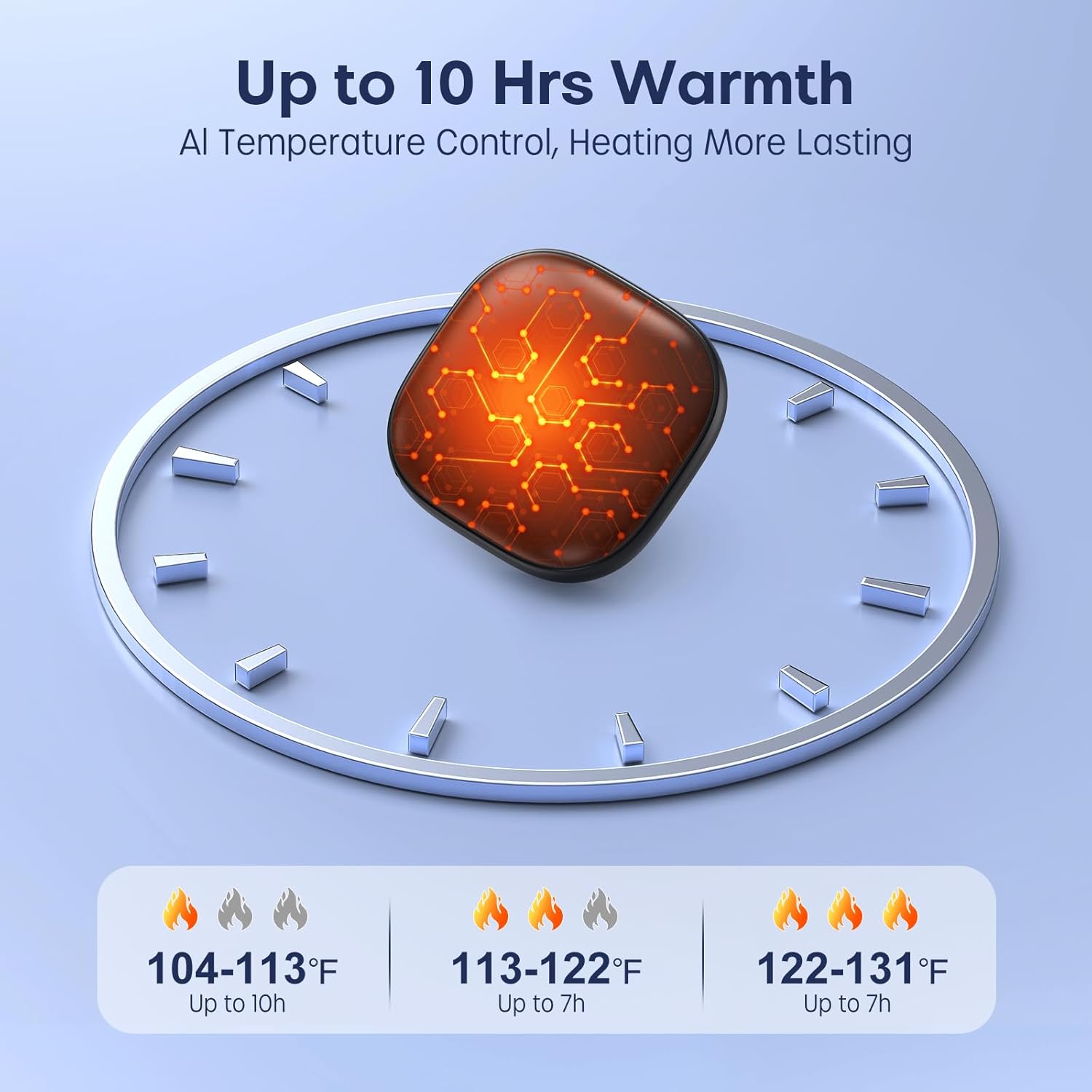 - Instant, long-lasting heat: Experience instant warmth in just seconds! With three adjustable heat levels reaching up to 131°F, this warmer delivers up to 8 hours of continuous heatâideal for winter activities and soothing conditions like Raynaudâs