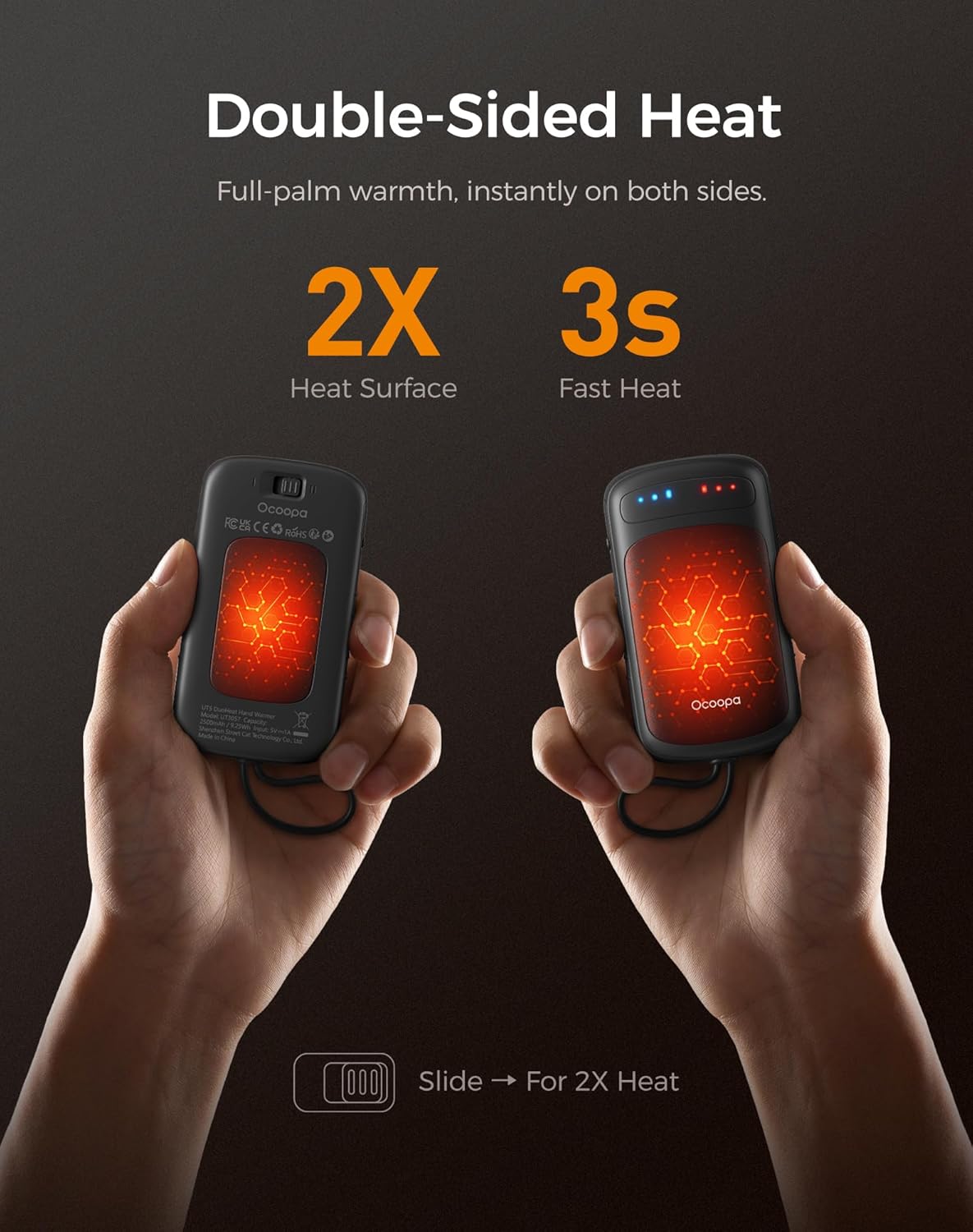 - Instant Full-Palm Warmth β Double heat area with the dual-sided electric hand warmers, heats up in just 3 seconds, full-palm warmth from palm to fingers, perfect for camping, hunting, fishing, hiking, or the daily winter outdoors.