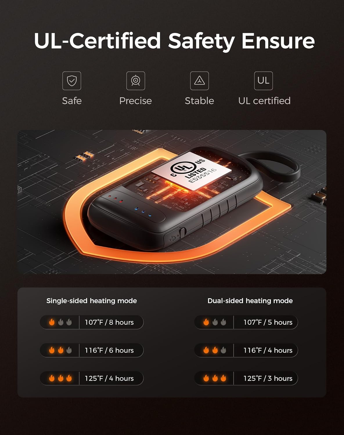 - Certified Safe & Built to Last β This usb hand warmers feature UL-certified batteries (E535516) with ultra-durable ABS shell, and full protection against overheating or overcharging. Stay warm up to 8 hours max on a single charge.
