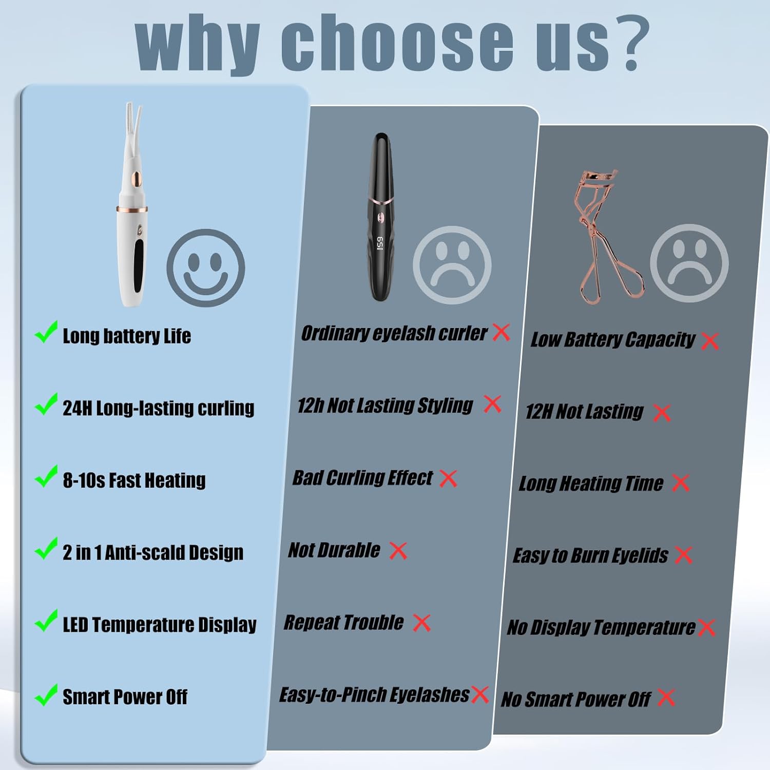 - Adjust Temperature Mode - Our heated eye lash curler comes with 3 temperature settings from 150Β°F to 190Β°F to gently curl your lashes and create stunning curls for amazing curling effect for different types of eyelashes, will not frizzing or pinching them
